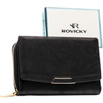 Skórzany portfel damski w czarnym kolorze zamykany suwakiem i zatrzaskiem - Rovicky
