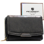Poręczny portfelik damski ze skóry naturalnej w czarnym kolorze zamykany zatrzaskiem i suwakiem - Peterson