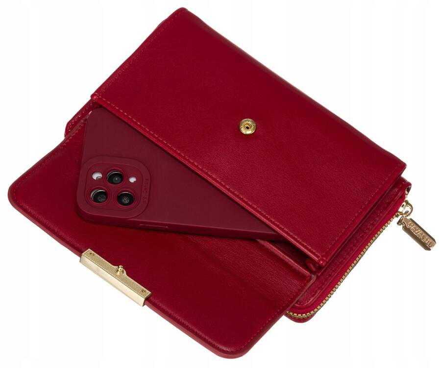 Na froncie torebko-portfela znajduje się praktyczna kieszeń na telefon o wymiarach 8x16,5x1,5 cm. Kieszeń posiada klapkę z zapięciem typu zatrzask.