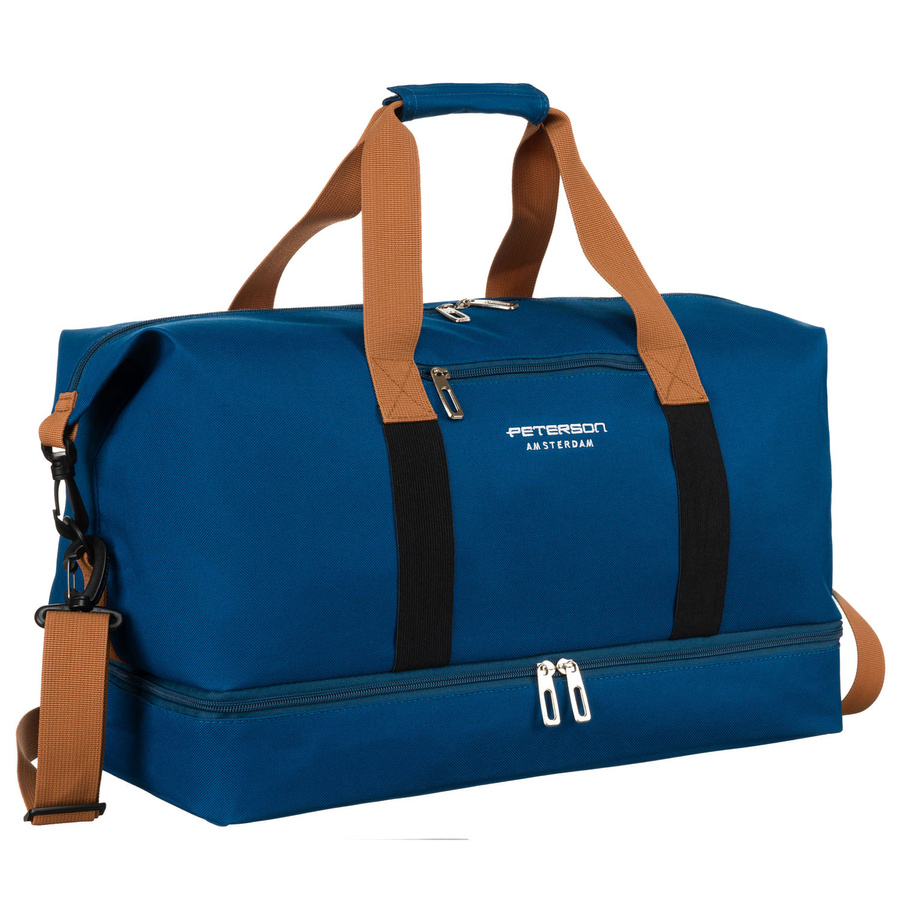 - Granatowa torba wykonana z poliestru. Dwukomorowa. Wodoodporna przegroda świetnie sprawdza się jako oddzielna przestrzeń na obuwie lub mokre rzeczy. Regulowany pasek i solidne uchwyty zapewniają komfort noszenia.
