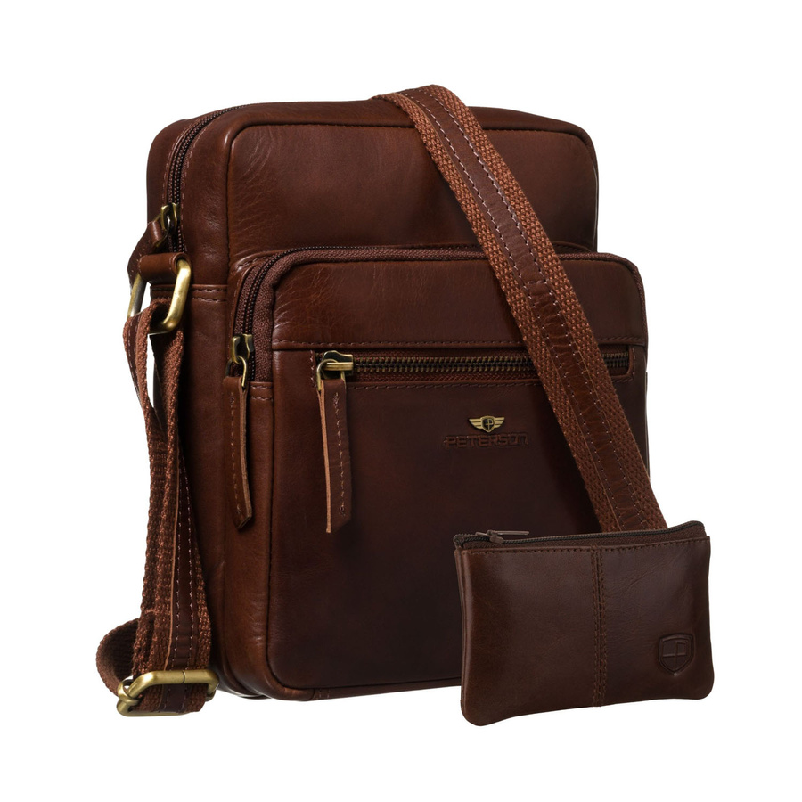 Miejska torba męska ze skóry naturalnej w brązowym kolorze, zawieszona na regulowanym pasku - Peterson
