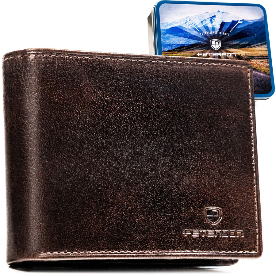 Duży portfel męski ze skóry naturalnej w brązowym kolorze wyposażony w system RFID - Peterson