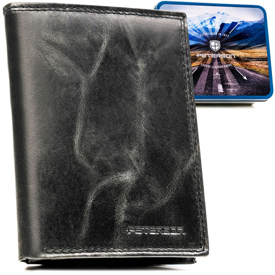 Pionowy, skórzany portfel męski w czarnym kolorze bez zapięcia zewnętrznego - Peterson