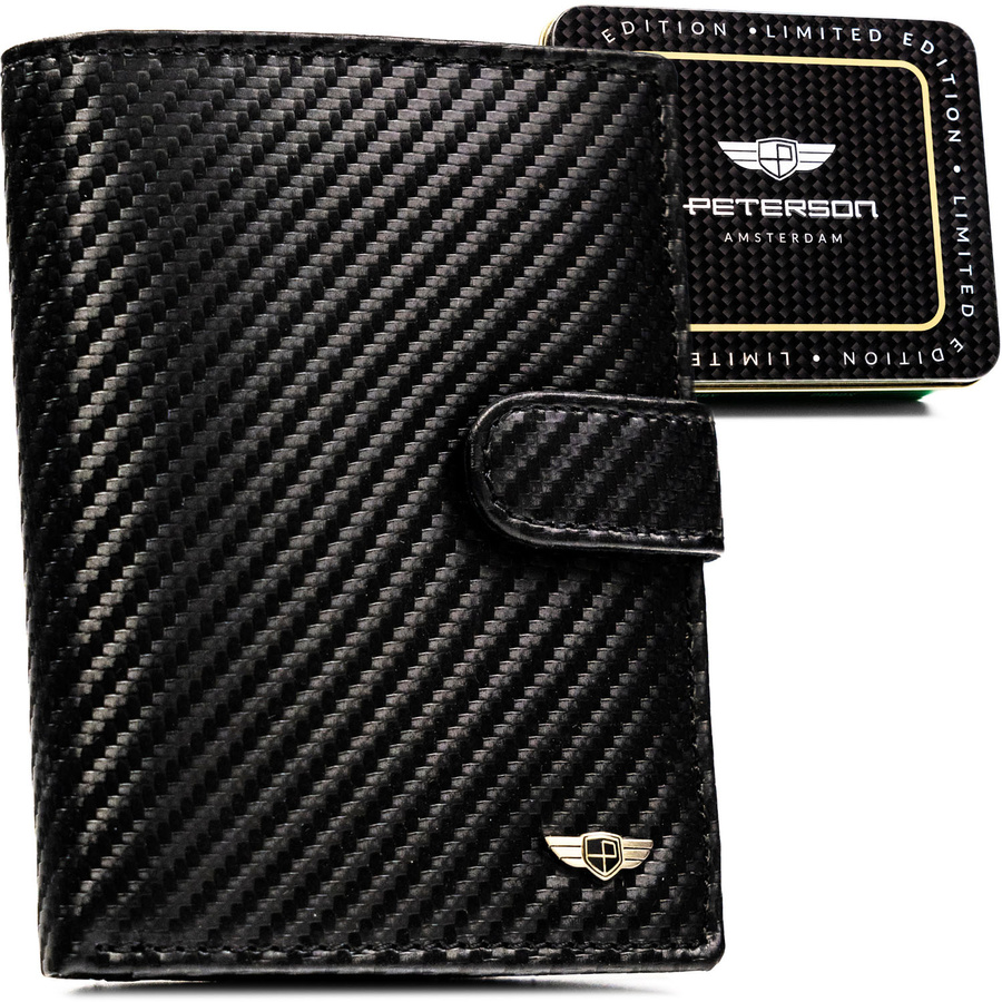 Pionowy portfel męski ze skóry naturalnej w czarnym kolorze wyposażony w system RFID, w zestawie z brelokiem - Peterson