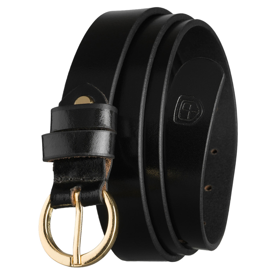 Skórzany pasek damski w czarnym kolorze ze złotą, klasyczną klamrą - Peterson