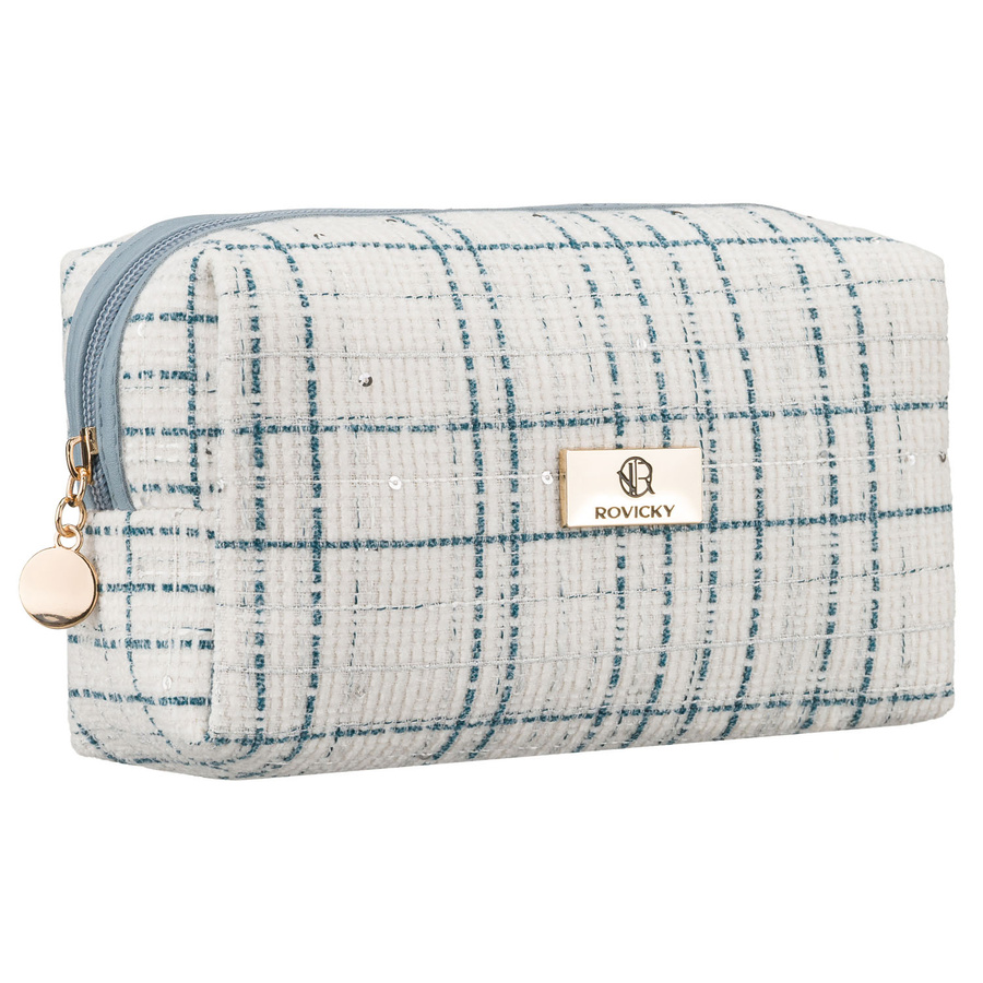 - Kosmetyczka damska z tkaniny syntetycznej pokryta wzorem w kratę. Jednokomorowa w niebieskim kolorze. Zamykana bezpiecznym suwakiem. Na froncie ozdobna tabliczka z logo marki.