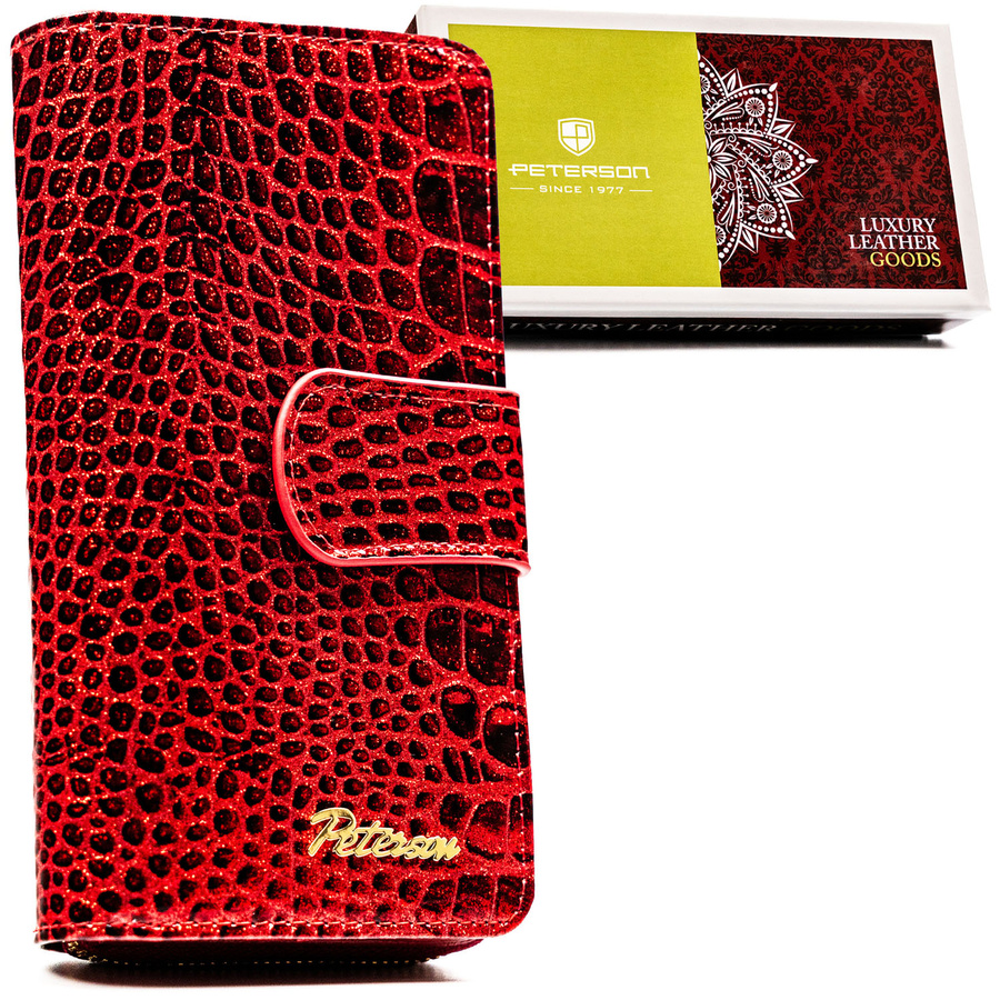 Czerwony portfel damski ze skóry naturalnej zamykany na suwak i zatrzask, wyposażony w system RFID - Peterson